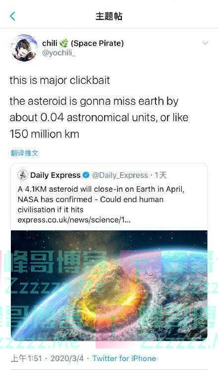 一颗4.1KM小行星将于4月接近地球,如果撞上,可能会终止人类文明》发布于2020-3-6