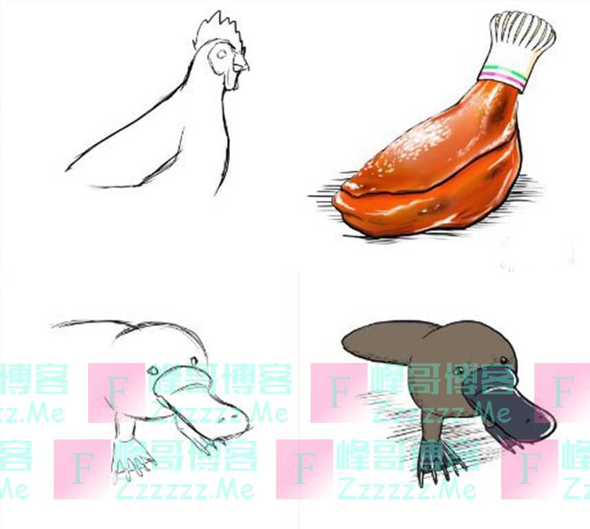 画一半就放弃的小公鸡和鸭嘴兽,最终还是没能逃过漫画家的“魔爪”,“重生”后的它们变成了一只鸡腿和双足兽,还别说这双足兽看起来也挺萌呆的,鸡腿也很诱人,看得小哔都饿了。