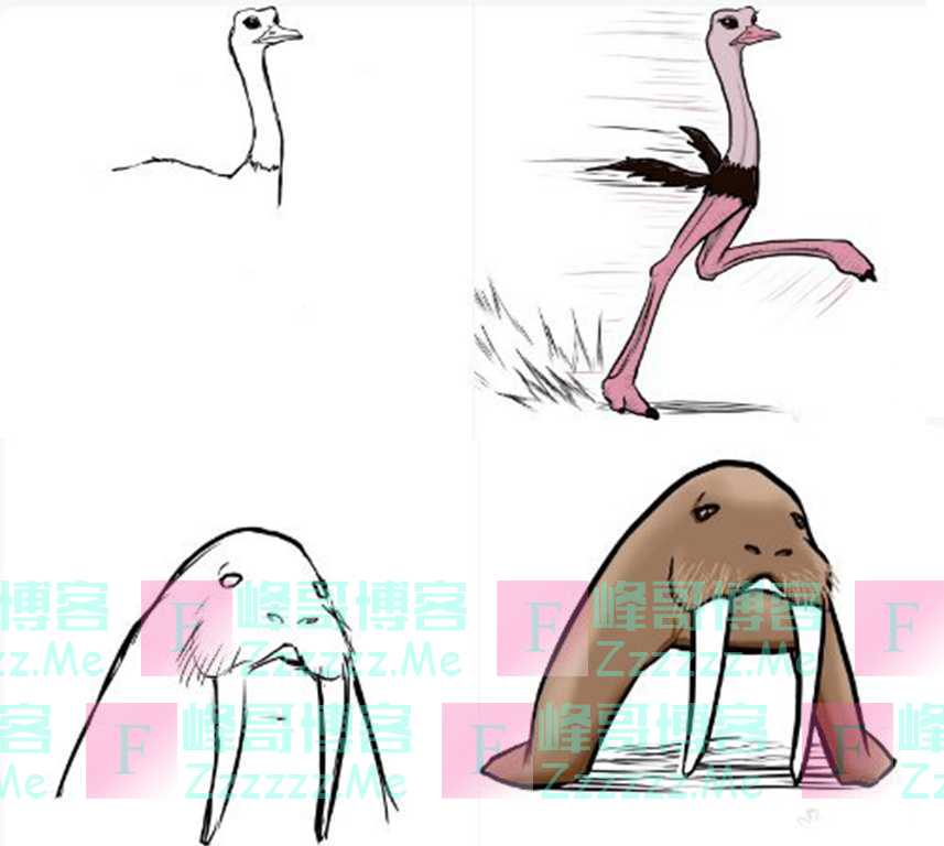 奔跑中的鸵鸟和傻萌傻萌的海狮也是“受害者”之一,被漫画家接着画以后,鸵鸟直接变成了“人字”型的迷之生物,身子完全被忽略,戴着两只小翅膀欢快地奔跑……这海狮更可怜,直接变成“海狮帽”,这无奈的小眼神透着满满的伤感。