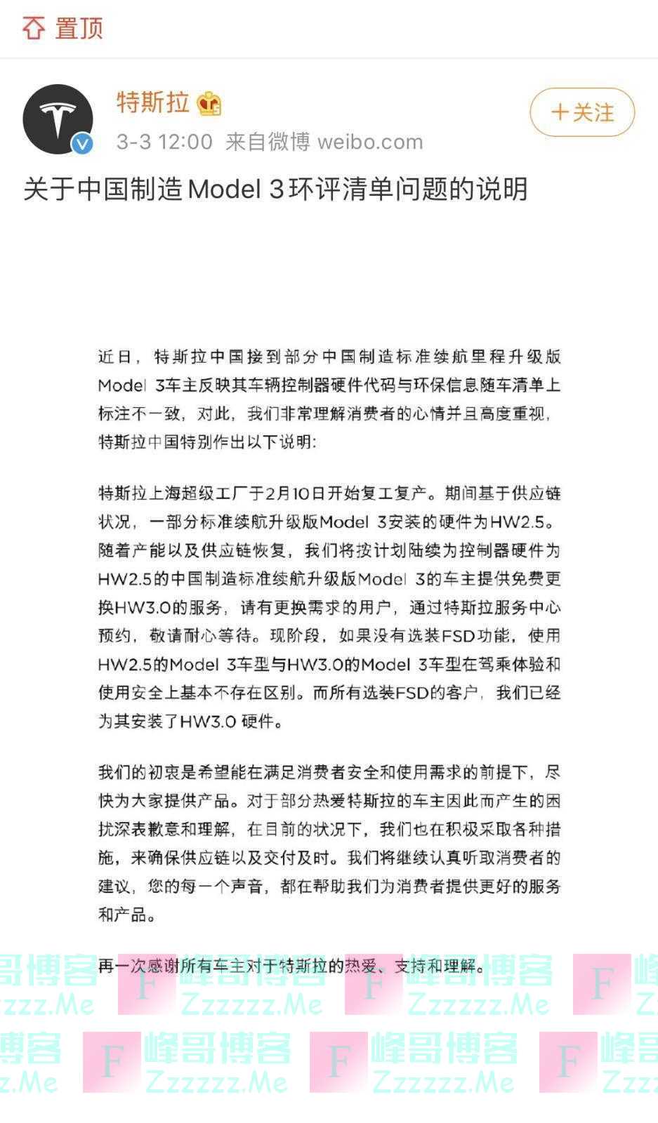 3月3日,特斯拉官方微博发布了“关于中国制造Model 3环评清单问题的说明”。大概意思就是说受到了新冠肺炎疫情的影响,供应链出现了状况,所以安装了HW2.5。后续随着供应链恢复,将陆续提供免费更换HW3.0的服务。并且,特斯拉还强调,如果车主没有选装FSD功能,那么HW2.5和HW3.0的Model 3在驾乘体验和安全基本不存在区别。这就是被我简化了的,“特斯拉减配门”大致经过。
