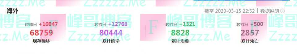 截止到3月15日22时,海外现存确诊病例68759例,累计确诊病例80444例,即将超过我国81062例,累计治愈8130,累计死亡2358。单日新增12768例,再创历史新高。