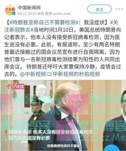 3月10日,特朗普面对记者提问时回应:虽然接触过两名正在隔离的议员,但自己并未接受新冠病毒检测。
