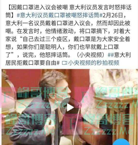 2月26日,一名意大利议员因戴口罩参与议会而遭到群嘲,他怒摔话筒:“我去过三个疫区,深知病毒危害,戴口罩是为了大家安全!”