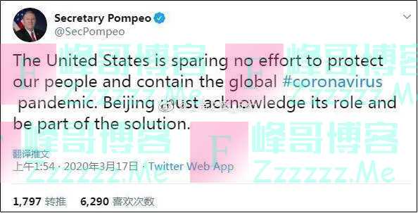 与此同时,美国国务卿再次公然称呼此次病毒为“武汉病毒”(Wuhan virus)。