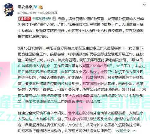 3月18日北京的出入境管理局在疫情防控新闻发布会新闻发布会上宣布,因梁某妍不配合国内的疫情防控工作,决定取消她的北京的工作居留许可,命令梁某妍限期出境。