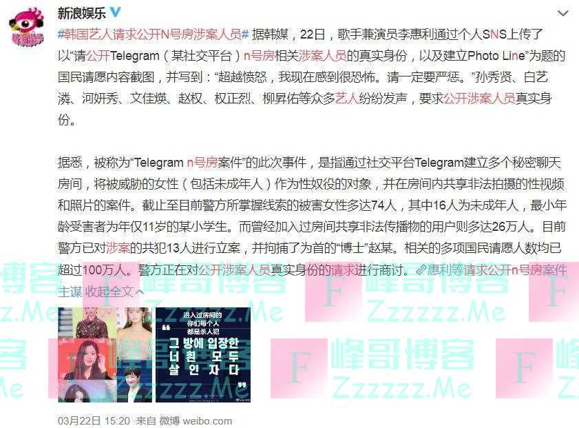 以李惠利为首的一众韩国明星,纷纷在SNS上传了“公开‘N号房’涉案人员的真实身份,并建立照片库”为题的请愿截图。