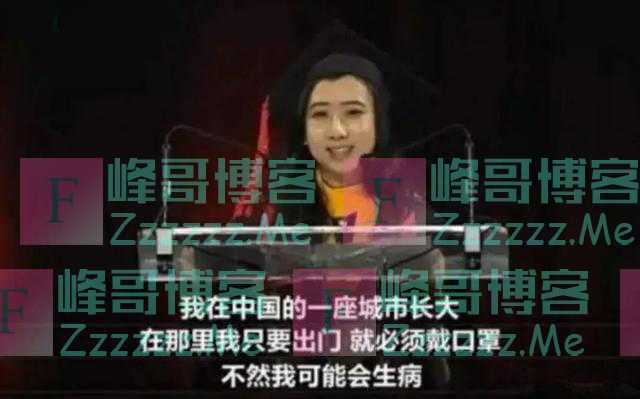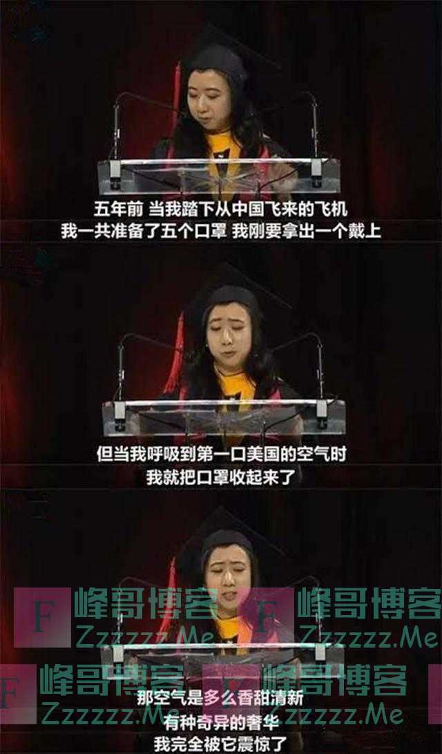 2017年5月21日,在马里兰大学毕业典礼上,她代表中国留学生发言,说自己来到美国那一刻,真是惊呆了,她说自己生活的地方空气不太好,出门就必须要戴口罩,不然就会生病。