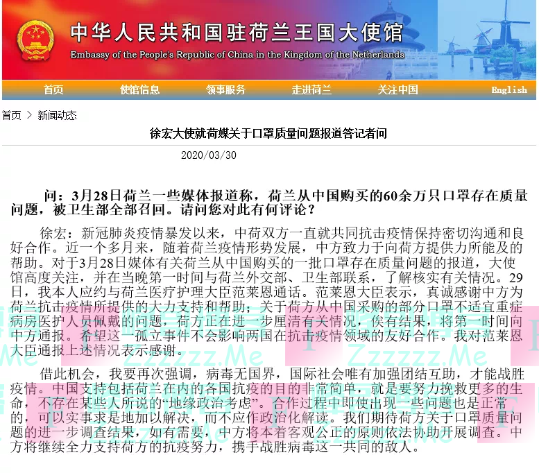 荷兰污蔑中国口罩,官方硬核回应:暂停所有出口荷兰医疗产品许可》发布于2020-4-2