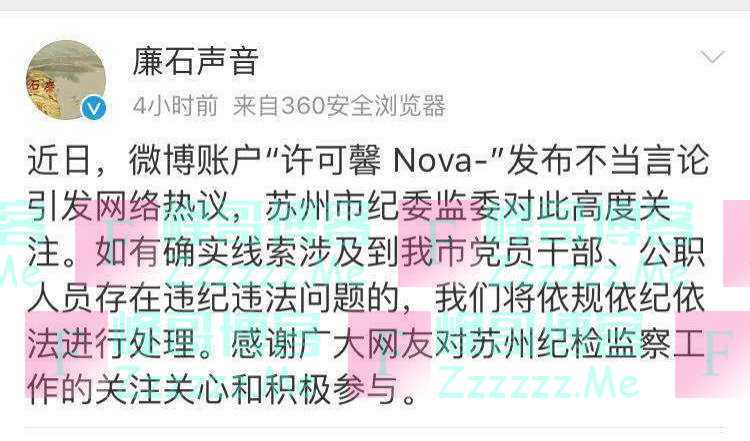 终于,网络舆情的发酵引起了当地纪检部门的关注,名为“廉石”声音的账号发布信息,表示苏州纪委监委已经关注到这件事,如果涉及苏州市相关领导干部存在违纪问题,会依法依纪处理。