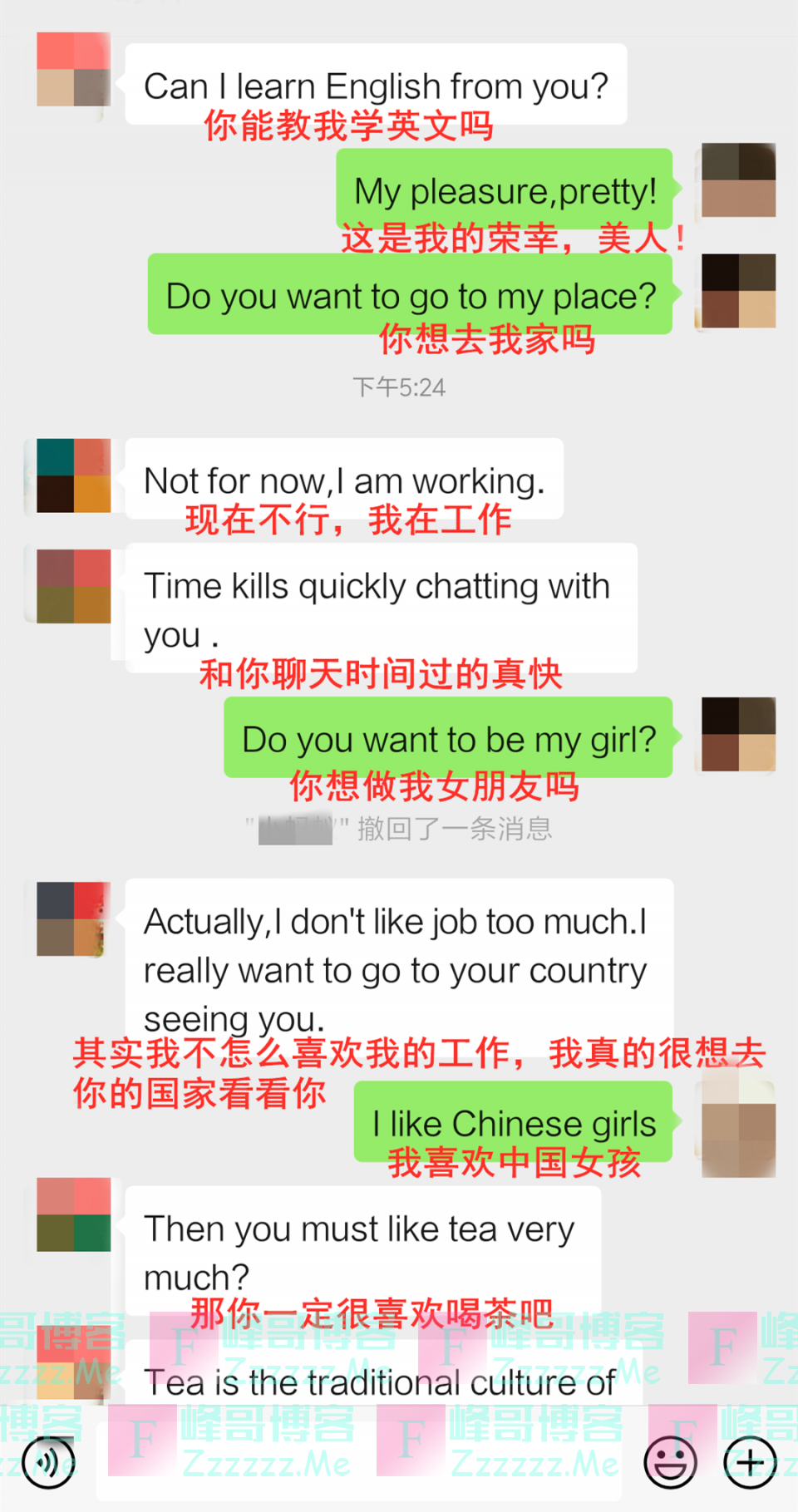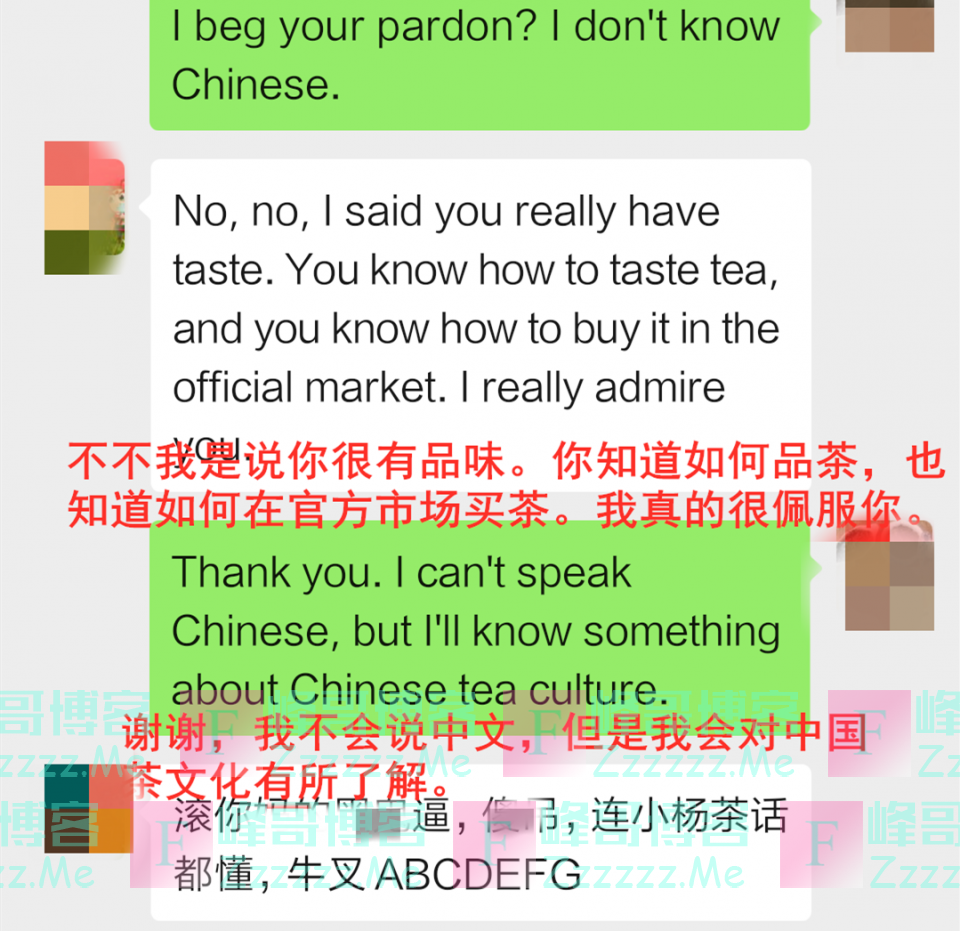 一开始和往常一样,茶叶女加了人以后做了自我介绍,不过对方却是一名外国人,听不懂中文。于是茶叶女就开始全程飙英文,而这些所谓的英文交流,小编宁愿相信他们是在线翻译的。