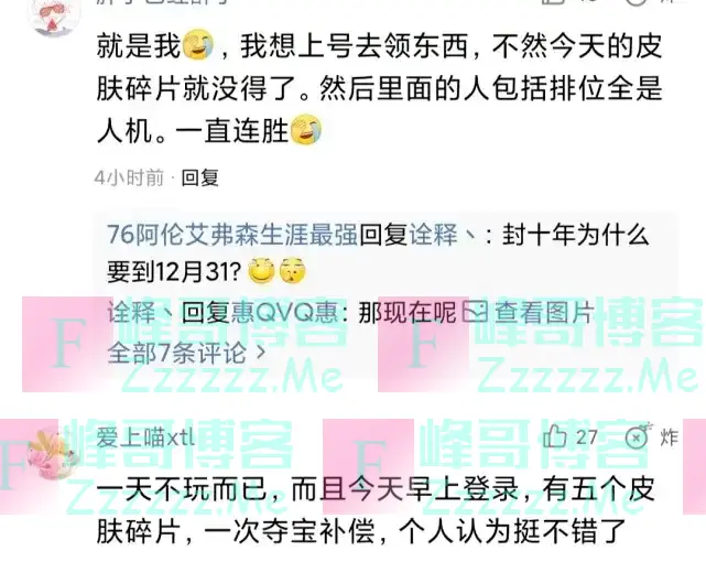在通过这样的方式获得对局的胜利之后,该玩家也是十分窃喜,一天上40颗星,这对于任何一个王者荣耀玩家而言都几乎是很难完成的。我们知道,4月5日官方对于停服发放了补偿奖励,今天登录游戏就可以领取:五个皮肤碎片+4000战令经验+积分夺宝券。可是该玩家在今天登录游戏准备领取补偿的时候就得到了这样一个通告: