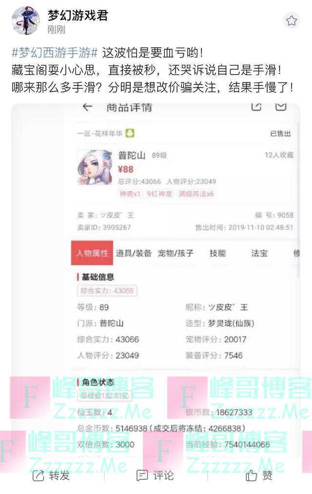 梦幻西游手游:玩家卖号血亏9000,1.1万的号88元售出,喜闻乐见》发布于2020-4-6