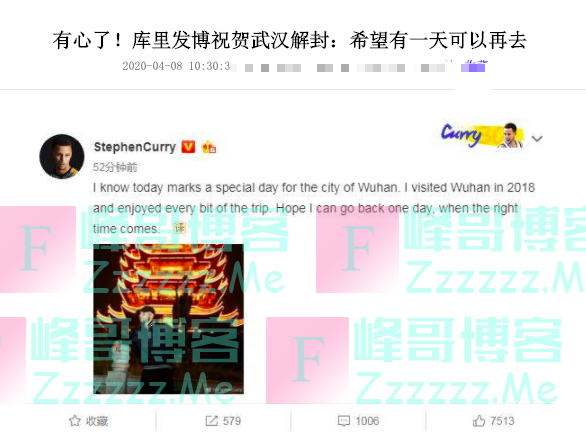 而此前就去过中国武汉参加活动,登上过黄鹤楼的NBA3冠王巨星史蒂芬库里,就对此颇为感慨,库里在社交媒体上用英文表示,今天对于武汉来说是一个非常特殊的日子,我知道这一点,2018年的时候,我曾经去武汉参加活动,在旅途中我非常享受,非常喜欢武汉,希望有一天到了适当的时候,我能够再去一次武汉。库里还晒出了自己在黄鹤楼,夜间登高俯瞰武汉城区的照片,得到了中国球迷们的集体点赞,很快就收获了1万个赞。