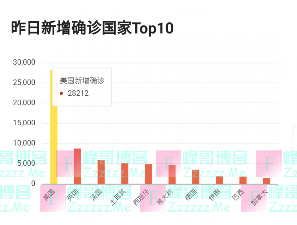 二、24小时新增确诊前10位的国家:这个数据从高到低依次是:美国28212,英国8719,法国5858,土耳其5138,西班牙4830,意大利4694,德国3479,伊朗1837,巴西1767,加拿大1383。