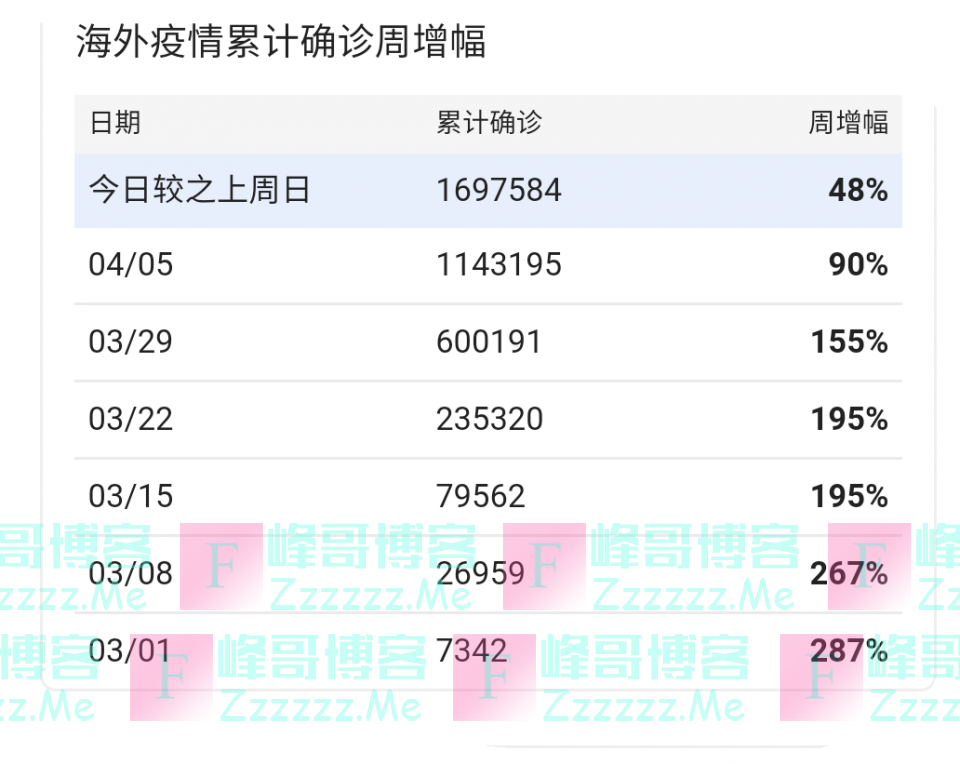 三、海外累计确诊每周增幅:从3月1日开始算起,每周增幅逐渐降低,这主要与基数不断扩大有关。五周以来,单周累计确诊增幅依次是287%,267%,195%,195%,155%,90%,今日较上周增幅为48%。周增幅虽然逐渐降低,但累计确诊数却急速扩大。