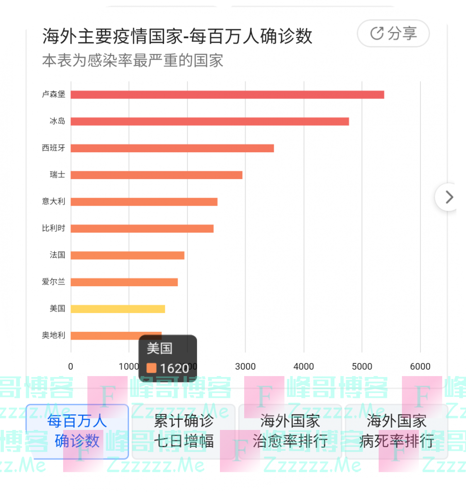 四、每百万人口感染数最高的十个国家:依次是卢森堡5381,冰岛4777,西班牙3489,瑞士2948,意大利2520,比利时2453,法国1952,爱尔兰1839,美国1620,奥地利1562。这里面比较大一点的国家只有美国、意大利、西班牙,其余均为小国,这个数据反映的是疫情防控工作做得最差的国家,美国赫然名列前十,可见,其抗疫工作的确糟糕透了。