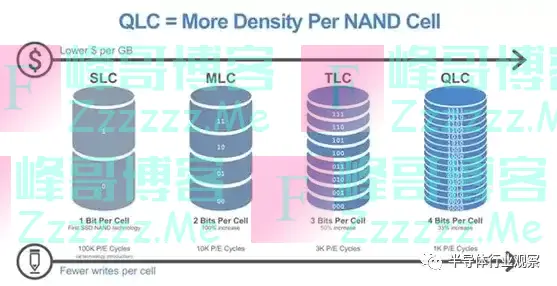 对闪存技术有了解的读者应该都知道,NAND 闪存通常可以分为SLC、MLC、TLC和QLC四类,QLC就是继TLC(3 bit/cell)后3D NAND的第四代存储方式,也是当前最新一代的闪存技术。从原理上看,QLC的每个单元可储存4个数据,那就意味着与前三种闪存相比,QLC闪存可以在同等的die面积上,存储更多的数据。拥有成本更低、容量更大、高密更高等特点,适合于读取密集型应用。