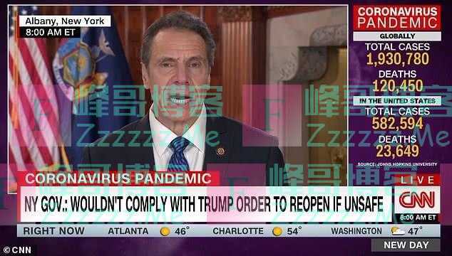 纽约州州长明确表示,他不会服从特朗普的任何重开纽约州的命令,并补充说,他将把这个问题提交法庭,让他们来裁决。