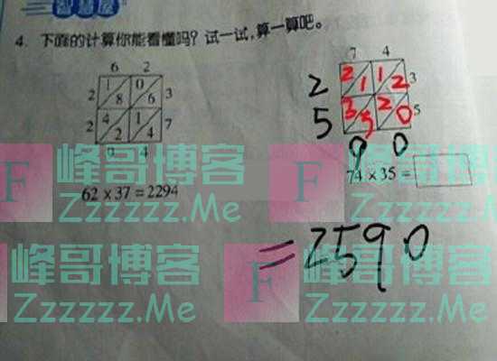 这道小学三年级的数学题是一道图形题目,给出了一个范例,让学生观察范例去做出另外一道题目。题目给出的一个正方形,然后正方形被瓜分成几个部分,每个部分里面都有一个数字,然后根据这些数字得出一个等式62X37=2294。然后需要解答的题目也是给出了一个正方形,可是图形里只给出了部分的数字,然后让解答一个等式:74X35= ?