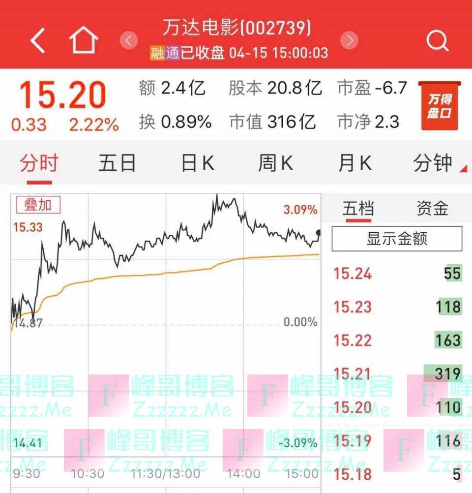 截至4月15日,万达电影今年以来股价下跌了16.25%,公司最新股价为15.20元,总市值316亿元。