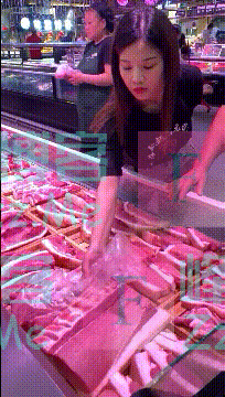 一看就是有钱的妹子啊!直接拿了一块最大的猪肉,大家说这块猪肉有多少斤,现在可以管多少钱呢?