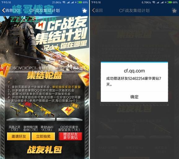 CF邀请1个好友免费领取7天豪华黄钻》发布于2018-3-14