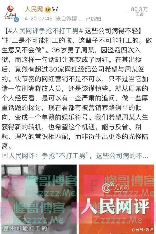 4月18日,凭借一句“打工是不可能打工的,这辈子都不可能打工的”的言论走红网络的电瓶小偷周X齐出狱。周某出狱当天,除了他的家人,还有网红经纪公司来到现场,30多家网红公司希望签约这位“南宁切格瓦拉”。