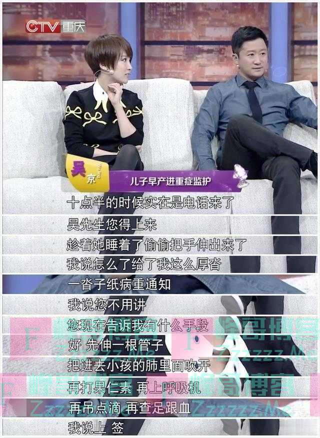 当他从医生处回到谢楠身边时,谢楠问他:“老公你怎么不要我了?”吴京连忙对她说:“没有,儿子去吸氧了。”听到吴京的回复,没过多久谢楠就抓着吴京的手睡着了,因为她剖腹产麻药的药效还没有过去。