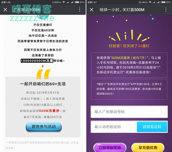 微信广东移动流量活动 地球一小时必得500M流量》发布于2018-3-23