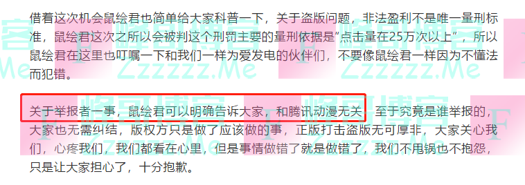 然后,我们在说会鼠绘回归这件事,在鼠绘汉化公众号的那篇文章中,鼠绘君先是为自己的犯罪行为表示了道歉,并且他还特别指出举报者和腾讯动漫无关。同时,鼠绘君也为众多关心他的粉丝们表示了感谢。