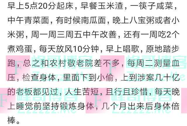 监狱虽然名字不好听,但是这个作息时间,以及劳作才是正常的作息规律,只是现在的人自由散漫惯了,一时不适应,我农村小时候,都这样的,又能锻炼身体又能时刻提醒你,出来了身体倍棒,思想也正直了,当然不是要你们进去啊,即使不坐牢也可以按照这样的规律来约束自己。