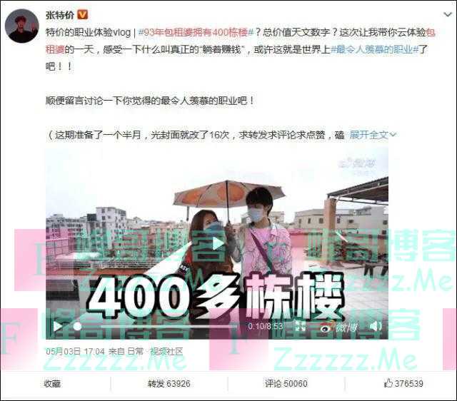 5月3日,网友@张特价 发出一个特别的职业体验视频,介绍了一位在广州白云区的93年包租婆的收租生活,而视频里的“400栋楼”“估值过亿”等内容引起了网友的广泛关注,当晚“93年女生坐拥400栋楼”就成了微博里的热门话题。