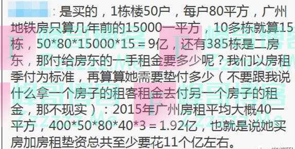 除了质疑该女子资产之外,还有网友质疑其缴税问题。有网友认为,倘若400栋房产租赁属实,按广州最低房租纳税标准,一个月租金收入将超一亿,一年需要缴税近4亿。