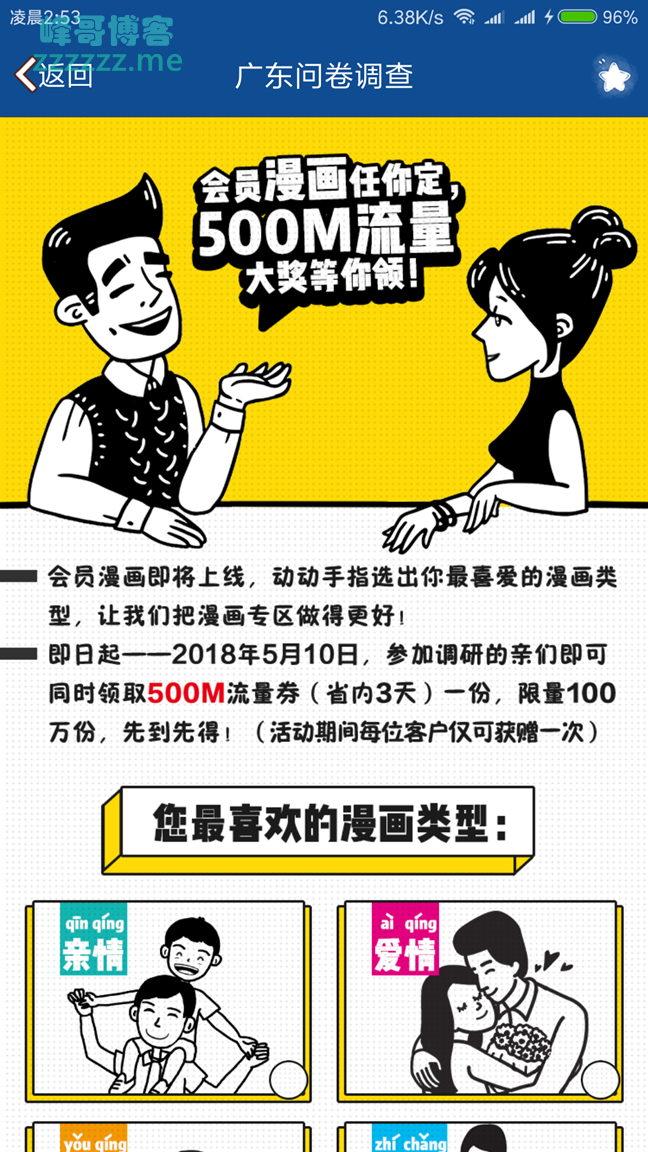 广东移动送500m流量 - 漫画调查问卷活动》发布于2018-4-25