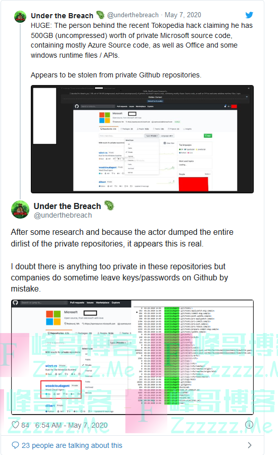 随后这条消息得到了数据泄露监控和防范服务机构Under the Breach推特账户的证实。需要注意的是,尽管此次泄露的源代码规模很大,但不代表黑客会获取到微软的核心商业机密,微软在GitHub仓库中存储的内容一般都是公开的,即便存储在私人仓库中的内容也是如此,而且微软还会严格筛查上传的代码来杜绝泄露的情况。