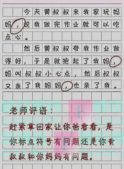 哎哟我去~小朋友你这篇作文儿看得我是心惊胆战呀,你赶紧把这篇作文拿回家让你老爸瞧瞧吧,这到底是你标点符号有问题?还是你黄叔叔和你妈咪之间有问题??