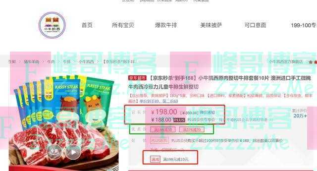 这款牛排在某东的标价为198元,PLUS会员188元,满188元还可以领30元的券,到手价为158元,下单就送刀叉、还送锅,这款锅在某宝价格约50元左右。