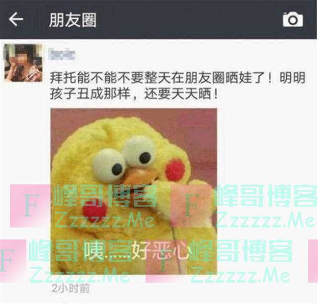 小周顿时觉得有些不开心,心想:那你朋友圈发的都是什么呢?于是就点到对方空间去看,没想到同事还专门发了个朋友圈嘲讽道:能不能别在朋友圈晒娃了,孩子明明那么丑,还天天晒!