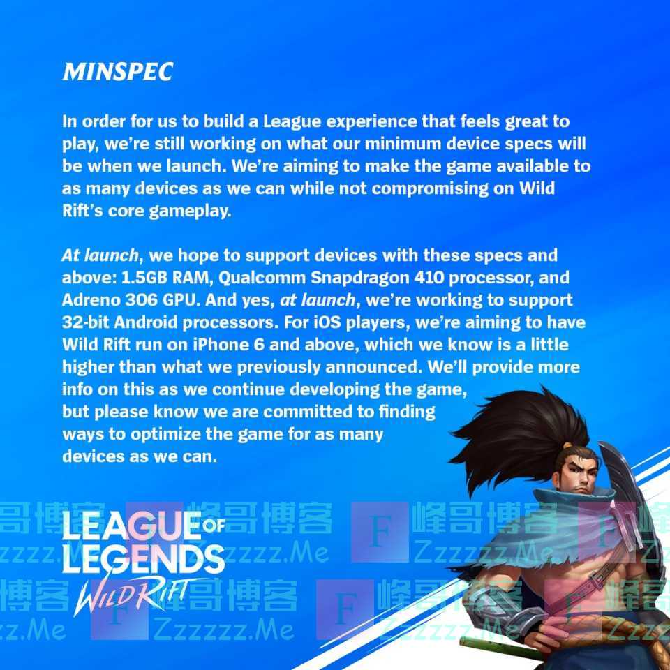 此外,拳头还公布了《英雄联盟》手游的配置要求,Android 平台方面硬件要求为骁龙 410 处理器 + Adreno306 GPU + 1.5GB RAM 或更高配置,正式发布时还将支持 32 位设备;iOS 平台方面需要 iPhone 6(A8 芯片)或更新机型才能运行。