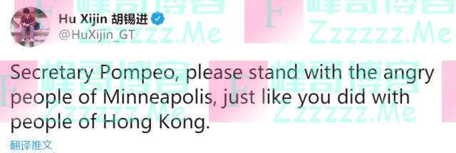 老胡刚刚发推特,对美国国务卿蓬佩奥说:请你与明尼苏达愤怒的民众站在一起,就像你表示的与香港人站在一起一样。