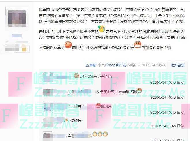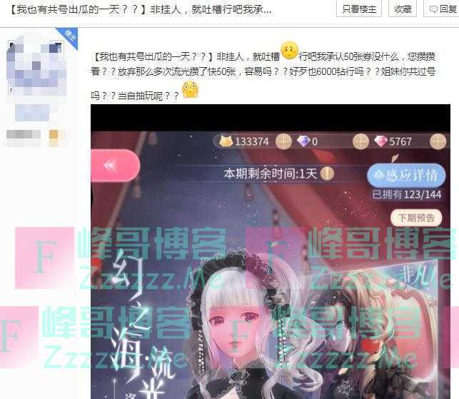 从图中可以看到,这名玩家自称自己找了一个姐妹共号,这位小姐妹在没有经过号者的同意的情况下,将号主游戏里的50张幻阁券用掉了。按照游戏的价值,一张券可以抽一次幻阁,一次格需要花费120钻石,50张券加起来就是6000钻石。6000钻石换算成人民币的话,也相当于600块钱啊。根据暖暖的游戏机制,每个星期暖暖玩家都可以通过联盟商店免费兑换3张券,即使这位玩家靠联盟商店攒到50张券,不难推算出想攒50张券,至少需要花费10个星期,粗算也是将近2个月的时间。辛辛苦苦攒了2个月的券就算是免费的,也会耗费号主大量的时间成本啊,共号随意动用,那真是堪比割肉啊。众所周知,闪耀暖暖每隔一段时间就会出一次大型活动,幻阁券也是可以用来参加活动奖池里的服装的,不难想象,该玩家至少在2个月的时间内都没有参加过任何游戏活动,她抵制住参加游戏活动的冲动,结果这样辛苦积攒的券却全被用掉了。更让人气愤的是,这位共号的姐妹来了5次十连,却没有出一个新品。正当号主在vx上询问的时候,这位姐妹却像人间蒸发一样消失了,自此就再也没有回复过消息。可以推测出这位姐妹是担心号主向她寻求赔偿,于是索性开始“装死”,毕竟50张券换算成人民币少说也要600块,这还不算号主为了攒齐付出的时间成本。在茶茶看来,这种未经允许随便动用别人游戏资源的行为是十分可恶的,毕竟号主自己都舍不得用,结果一个路人却白白用掉了,着实让人心疼。