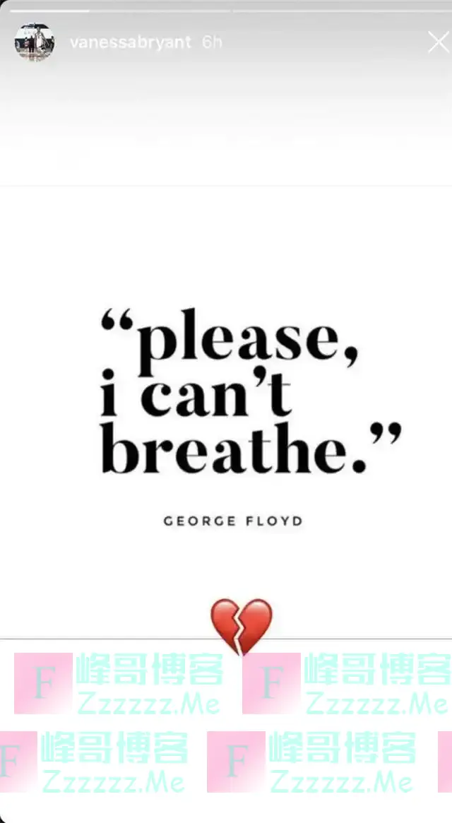 除了巨石强森在ins上发声以外,科比的妻子瓦妮莎也在ins上为弗洛伊德鸣不平,她在ins上写道:“我无法呼吸。”在后面还加上了一个心碎的表情。
