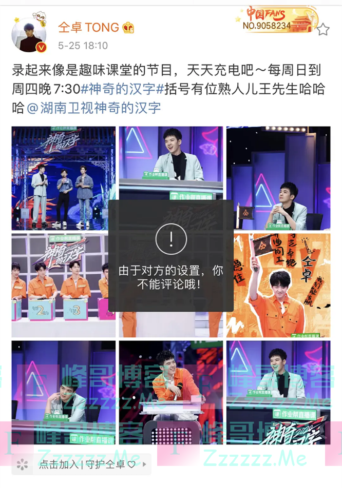 除此之外,仝卓还把微博设置为不能评论状态,但他依然保留了《神奇的汉字》节目宣传微博,不少网友都表示这很尴尬,很明显《神奇的汉字》节目组已经彻底弃用他了。目前仝卓的微博评论区也早已经沦陷,且目前为止仝卓态度傲慢,没有出来道歉认错,也是网友至今这么愤怒的原因之一。
