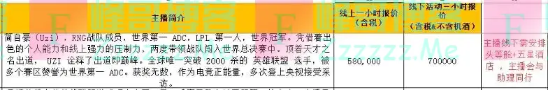 据一份Uzi经纪公司的报价单,Uzi参加一场商业活动的出场费是“3小时70万”,报价单最后还特意备注: