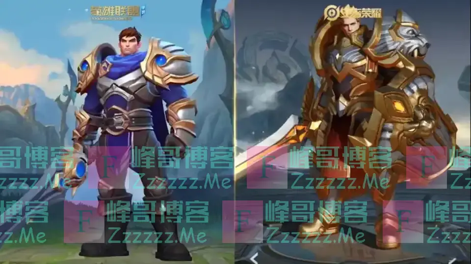首先就是王者荣耀的标志性英雄亚瑟,这个英雄我想大家都比较熟悉,毕竟大家玩的第一个英雄就是亚瑟。而在LOL里面,和亚瑟比较相似的就是盖伦,技能方面也是比较相近的,我想大家也都知道。从样子上来看,两个人都是重装战士,穿着沉重的铠甲,手里拿着一把大宝剑。不过不同点在于,亚瑟的左手还拿着一个盾牌,颜色方面也有不同之处。
