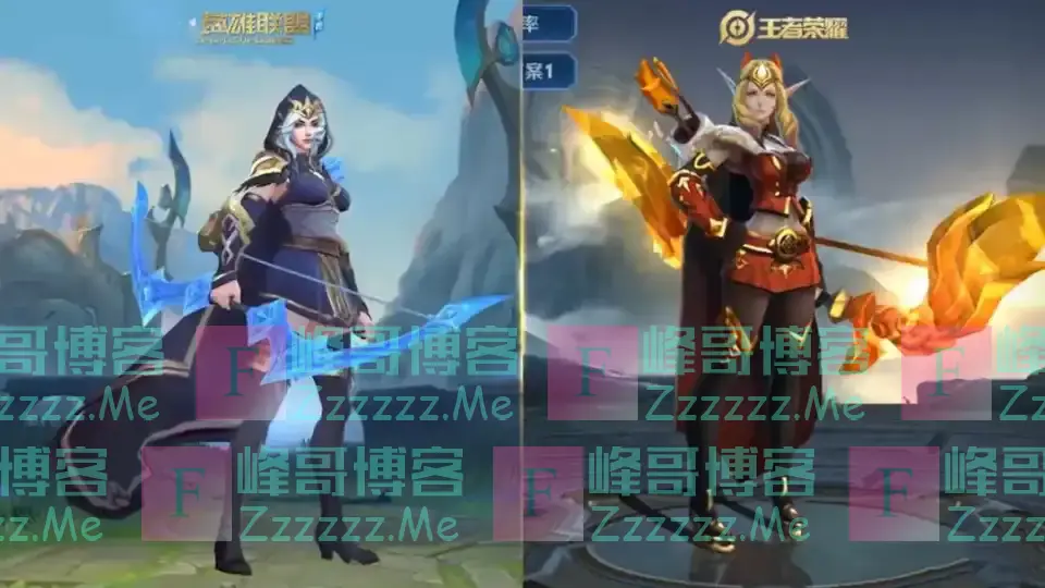 第三个是射手英雄,王者荣耀里面的绝版英雄艾琳和LOL里面的艾希。其实正常对比的话,应该是艾希和后羿做对比,不过后羿是男性英雄,不太好对比。从颜值上来看,这两个人是差不了太多的,都是高颜值美女。而且这两把弓也是各有特色,一把是寒冰弓,还有一把是火焰弓。
