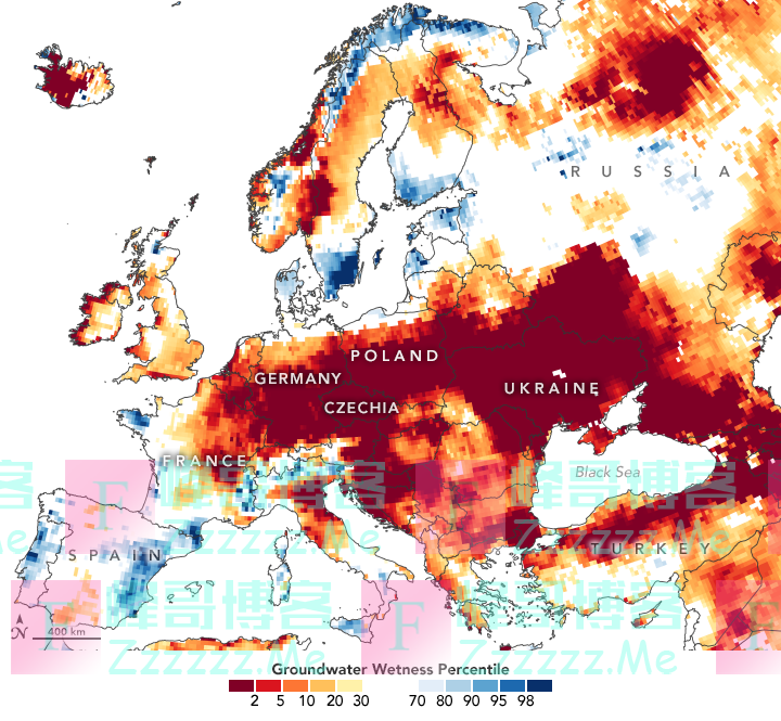 在这种情况下,欧洲多地的的干旱开始发展起来——近日,通过相关卫星数据和分析,科学家们给出了2020年6月22日欧洲的浅层地下水存量的情况,用颜色表示湿度百分位;也就是说,用这个图来显示地下水水平与该月的长期记录相比如何。蓝色区域的水比平时更多,橙色和红色区域的水少。最暗的红色代表干燥的情况,很明显,在西欧、中欧、东欧、南欧和北欧的很多地方,目前地下水水平已经减少到非常低的水平。