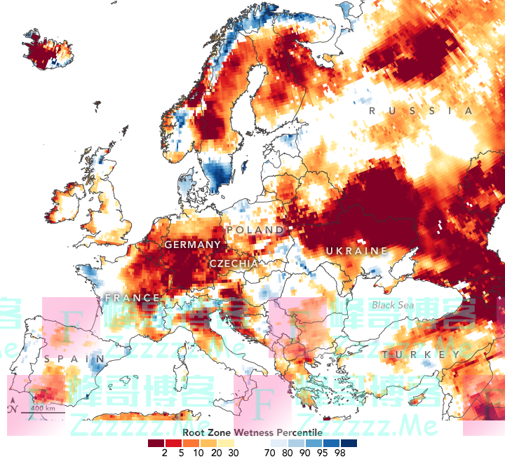 同时,科学家们也给出了根区湿度的监测情况,和地下水水平相比,监测根区水分对于农业至关重要,因为它能够给农作物补充水分,如果过少会对农业产生严重影响。因此可以看到的是,截至6月22日,欧洲多地根区水分都很低,这代表着多地的“超强干旱”,但根区水分可以通过降雨迅速补充,如果有降雨到来,是可以迅速改善这种局面的。