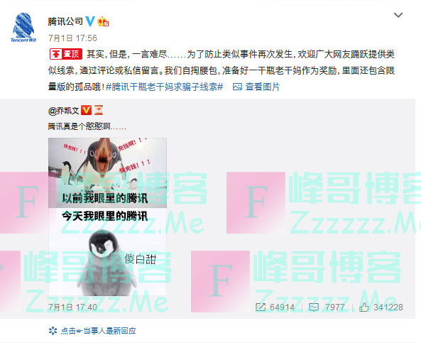 真相出来后,不仅网友们惊呆了,腾讯估计也是没想到,一个互联网巨头公司,竟然被三个不法人员哄得团团转,不仅损失了千万费用,更是让品牌形象受到损害。而腾讯公司的这一乌龙事件也被很多精英诟病,比如字节跳动副总裁李亮便在自己的就在自己的个人头条号上“内涵”腾讯。