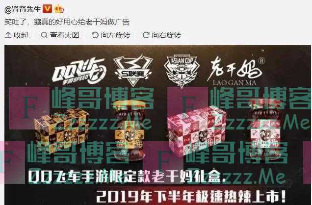 这里提到的广告应该就是去年给 QQ 飞车手游的 S 联赛冠名了一波,不仅游戏里面有各种老干妈联名服装,还专门请职业选手尬吹了一波老干妈,可以说是很用心了。